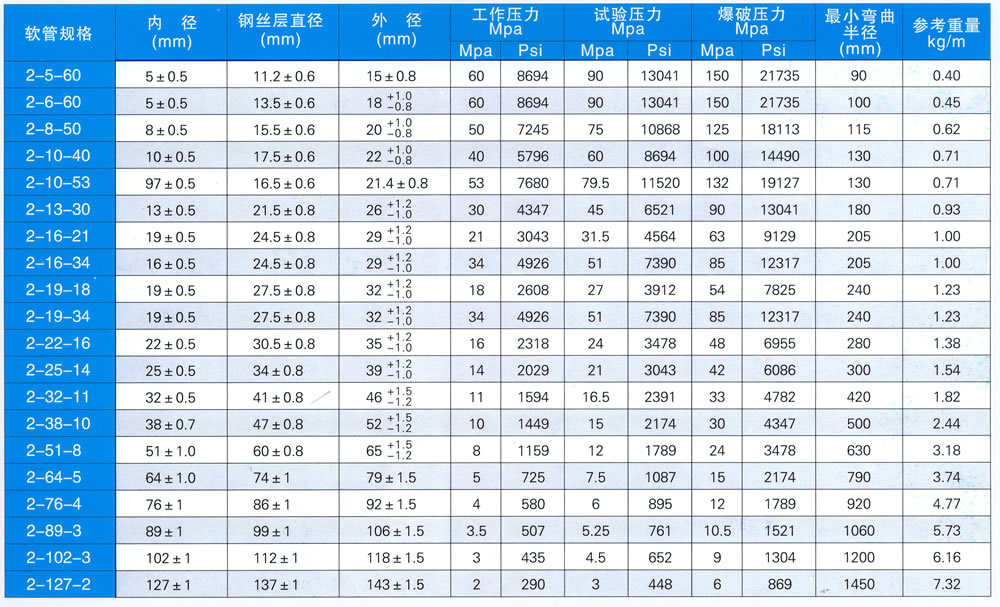 膠管由內膠層、兩層鋼絲編織層和外膠層組成。