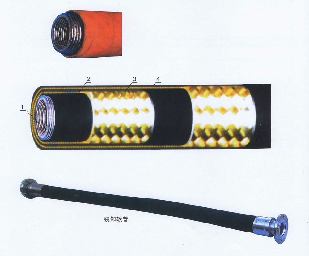其結構為:1、內層不銹鋼波絞管;2、耐溫防爆層;3、鋼編抗壓層;4、耐磨橡膠防護層。